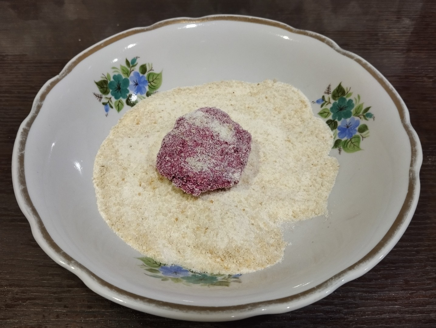 В тарелочку насыпьте манку или панировочные сухари. Столовой ложкой положите в тарелочку немного свекольного фарша.