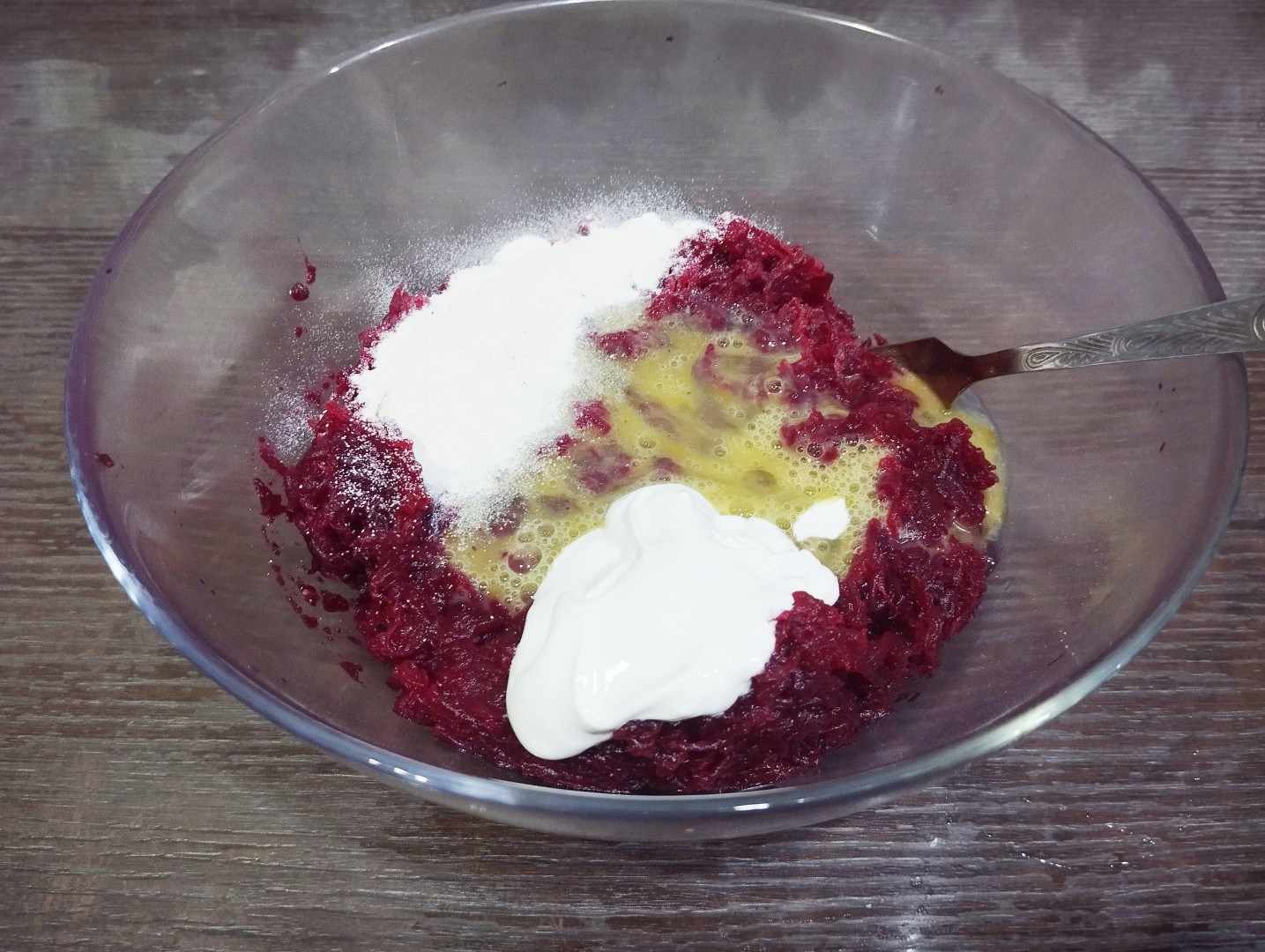 В миску с натертой свеклой добавьте манку, влейте яичную смесь, столовую ложку густой сметаны. Тщательно перемешайте ингредиенты. По желанию можете добавить репчатый лук и/или чеснок.