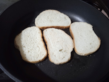 Бутерброды можно делать сразу на батоне. А можно его предварительно немного обжарить. Мне больше нравится обжаренный. Так у него появляется аппетитная хрустящая корочка. Я обжариваю батон с добавлением небольшого количества растительного масла. Но можно его просто немного подсушить на сухой сковороде.