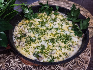 Готовый жульен с курицей и грибами на сковороде подавайте в горячем виде. Можно посыпать зеленью. Приятного аппетита!