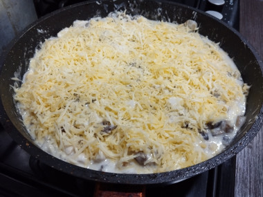 Жульен с курицей и шампиньонами хорошо подавать порционно. Разложите по порционным сковородкам и посыпьте тертым сыром. Подержите немного на огне, накрыв крышкой. Сыр должен расплавиться.