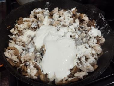 Добавьте сметану и сливки. Посыпьте мукой, добавьте соль и специи по вкусу и все перемешайте. Подержите жульен со сливками на огне еще 2-3 минуты. Соус станет гуще.