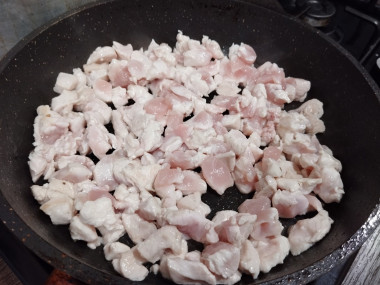 В эту же сковороду выложите нарезанное куриное мясо и обжаривайте его на сильном огне 3-5 минут, чтобы оно изменило цвет и на нем стала появляться корочка