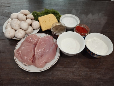 Как сделать жульен с курицей на сковороде со сметаной? Подготовьте для этого необходимые ингредиенты. В качестве куриного мяса можно взять филе грудки или филе бедер. Вместо шампиньонов можно взять любые другие грибы. Сливки и сметана могут быть любой жирности. Но чем выше будет жирность, тем сливочнее будет вкус.