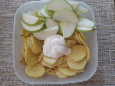 Яблоки так же нарежьте тонкими ломтиками и добавьте в чашу к картофелю.