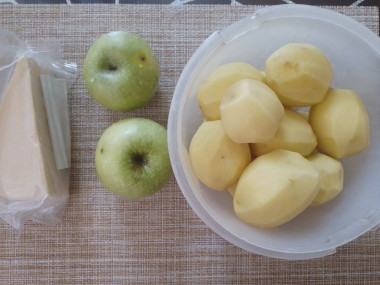 Как запечь картошку с яблоками в духовке? Подготовьте для этого необходимые ингредиенты. Картофель заранее очистите от кожуры и ополосните в проточной воде от загрязнений. Яблоки выбирайте кисло-сладкого вкуса. Сметану можно взять любой жирности. Сыр берите любой, но чтобы он был вкусным, качественным, без заменителей молочных жиров и хорошо плавился.