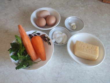 Как сделать салат морковь с сыром яйцом и чесноком? Сначала подготовьте все необходимые продукты. Вместо петрушки можете взять кинзу или укроп. Сыр берите любой твердый. Для заправки салата можете использовать майонез, йогурт или сметану, либо смесь из этих продуктов. Вместо свежей можно использовать морковь по-корейски. По желанию дополнительно добавьте в салат молотый перец или другие специи.