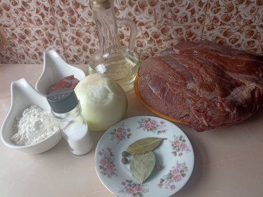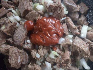 Был у меня кусочек говядины и решила приготовить гуляш из говядины как в СССР, как в советской столовой. Мясо нарезала средними кусочками,обжарила на сковороде, добавила лук, нарезанный средними кусочками и обжарила вместе. Добавила горячей воды, томатную пасту, соль,перец и протушила вместе примерно около 1 часа. Затем добавила муку,разведенную водой и ещё протушила минут 15 .