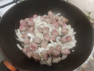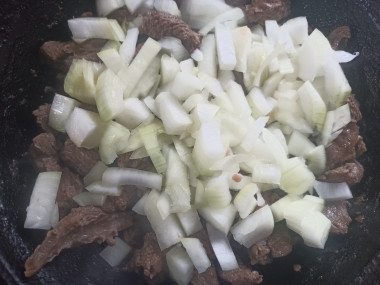 В сковороде с толстым дном на среднем огне разогрейте растительное масло. Выложите говядину и обжарьте, помешивая, до золотистой корочки.