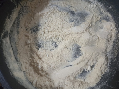 Отдельно на сухой сковороде при постоянном помешивании обжарьте муку до золотистого цвета и появления яркого орехового аромата.