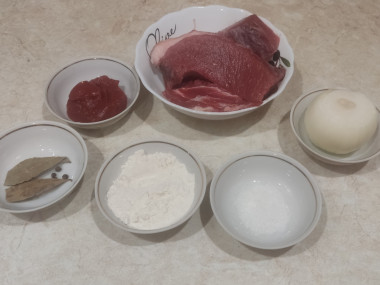 Как сделать гуляш из говядины как в СССР, как в советской столовой? Сначала подготовьте необходимые ингредиенты по списку. Если используете замороженное мясо, необходимо предварительно правильно его разморозить на нижней полке холодильника. Томатную пасту можете заменить на кетчуп. Растительное масло можете использовать любое, у меня подсолнечное.