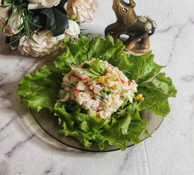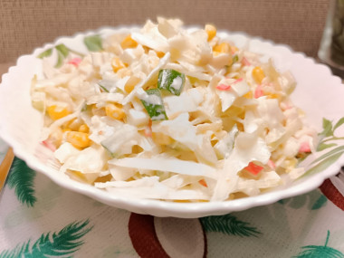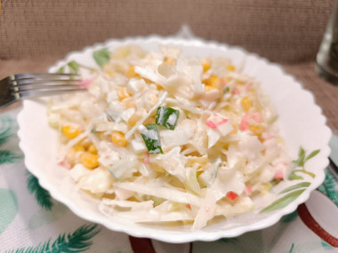 Салат пекинская капуста, огурец, крабовые палочки, кукуруза готов. Вы можете подать его в салатнике или на тарелке, выложив при помощи кулинарного кольца. Приятного аппетита!