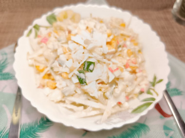 Люблю салаты из капусты и когда нашла рецепт салата с капустой,крабовыми палочками и огурцом, сразу решила попробовать.