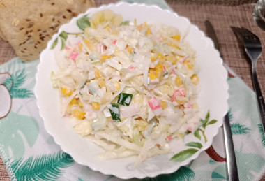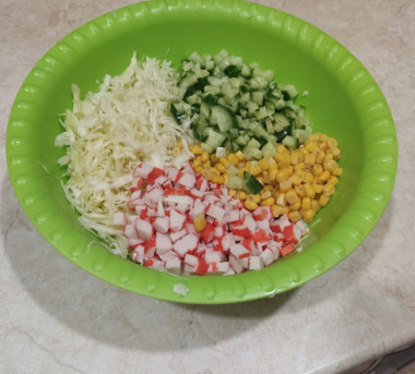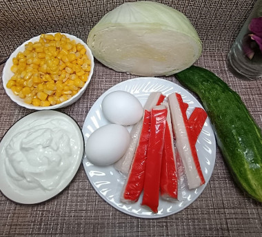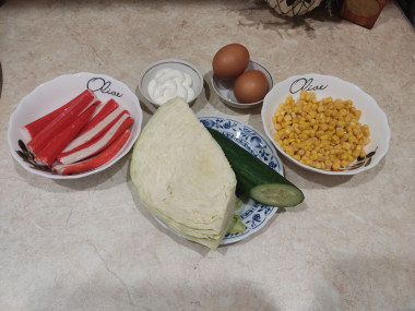 Как сделать салат с капустой, крабовыми палочками и огурцом? Подготовьте продукты. Яйца заранее отварите и остудите. Крабовые палочки, если они были заморожены, разморозьте. Кукурузу откиньте на сито, чтобы стекла вся жидкость. Капуста подойдет белокочанная или пекинская, обычную лучше возьмите молодую, с нежными листьями.