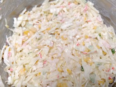 Капуста у меня была белокочанная, которую я нашинковала. Огурец и крабовые палочки также порезала мелкими кубиками. С кукурузы слила жидкость.