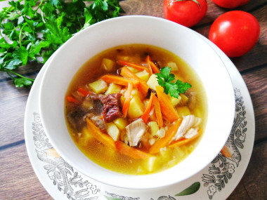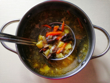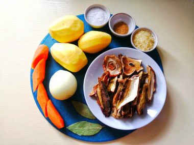 Начав готовку залила грибы горячей водой и оставила на 3 часа, чтобы они хорошенько пропитались и стали мягкими. Затем промыла их, нарезала и выложила вместе с лавровым листом в кипящий мясной бульон, варила грибы 10 минут (перец горошком добавлять не стала). После этого добавила в кастрюлю картошку и рис, варила до готовности картошки. В последнюю очередь отправила в кастрюлю зажарку из моркови и лука, молотый кориандр, и соль (зажарку сделала без болгарского перца). Варила суп на грибном бульоне еще 30 минут, пока пассерованные овощи не стали мягкими.