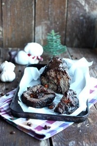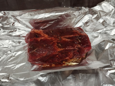 Замаринованное мясо достаньте и выложите верхней частью вниз на двойной слой фольги. Заверните фольгой и поставьте в духовку (в форме для запекания или противне). Духовку включите на 180 градусов. Запекайте говядину два часа.
