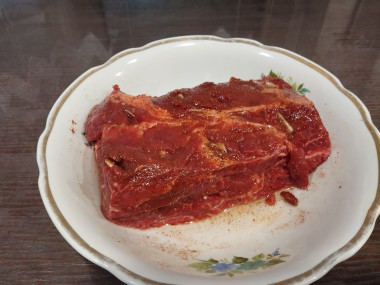 Вылейте часть масла на мясо, переверните его и вылейте оставшееся масло. Считается, что благодаря маслу мясо будет равномерно прогреваться и соответственно лучше приготовится. Мясо накройте плёнкой и уберите в холодильник мариноваться. Время маринования будет зависеть от того, какая часть говядины была выбрана. Моя "голяшка" оставалась в холодильнике целую ночь. Во время маринования мясо можно несколько раз аккуратно перевернуть.