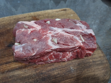 Чеснок очистите и нарежьте пластинами. Острым ножом сделайте по всему мясу маленькие надрезы и вложите в них пластины чеснока.