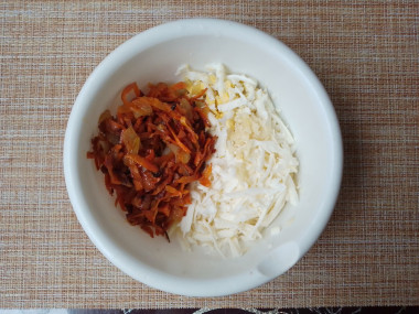 На сковороду добавьте растительное масло. Обжарьте на среднем огне подготовленные лук и морковь, периодически помешивая, до мягкости. Овощи остудите.