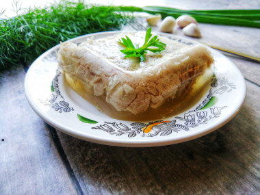 На выходной сделала холодец, взяв за основу рецепт холодца свиного с желатином. Готовила его из свинины и куриных окорочков, мне кажется, что свинина и курица сочетаются между собой и дополняют друг друга.