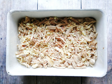 Готовое мясо выньте из бульона. Отделите мякоть от костей и нарежьте небольшими кусочками.