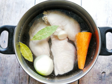 Мясо залила холодной водой, довела до кипения. Как только появилась пена, слила воду, промыла мясо, вновь залила его водой и поставила на огонь. Варила мясо с морковью, луком, лавровый листом, солью и чесноком. Взяла для бульона всего один зубчик чеснока, а три зубчика оставила на потом, чтобы добавить его свежим. Душистый перец добавлять не стала.