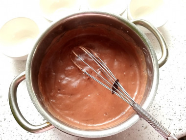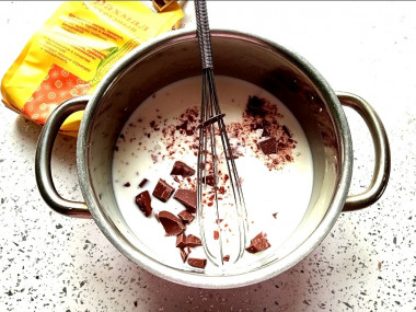Поставьте сотейник с молоком на средний огонь. Варите массу при постоянном размешивании венчиком. Шоколад от нагревания постепенно начнет таять, а крахмал — загущать молоко. Когда это начнет происходить, убавьте нагрев, а мешать начните интенсивнее, иначе низ "киселя" может пристать ко дну.