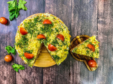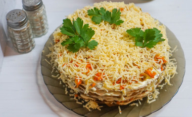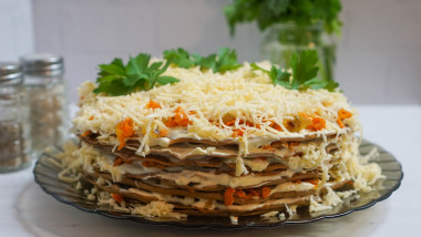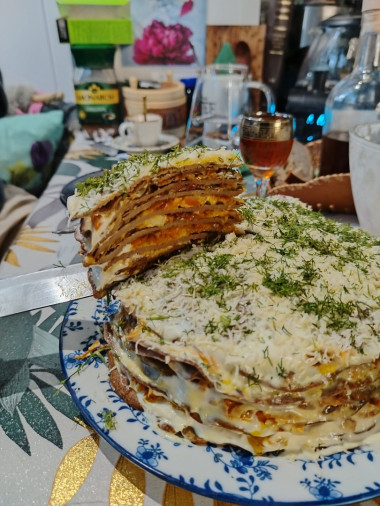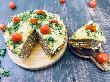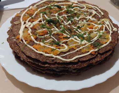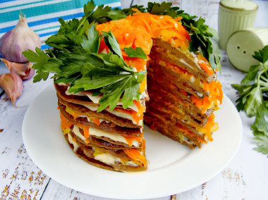 Иногда готовлю такой торт, но я еще добавляю в каждый слой, очень тонко нарезанный кругло помидор. Получается сочнее.