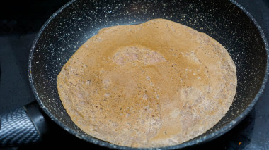 2. Возможно, температура жарки была слишком высокой. Из-за этого корж быстро схватился снаружи, но не успел пропечься внутри. Используйте средний или низкий огонь. Можно на пару минут накрыть сковороду крышкой - это поможет коржам пропечься равномерно. Проверяйте готовность коржа зубочисткой: она должна выходить сухой.