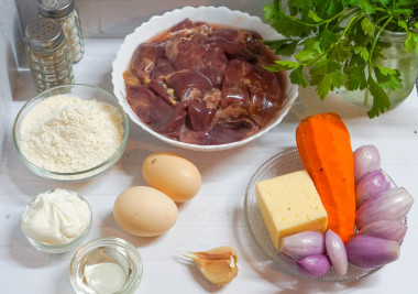 Калорийность продуктов: Куриная печень, Сметана, Яйца, Пшеничная мука, Растительное масло, Соль, Морковь, Лук репчатый, Майонез, Чеснок, Сыр любой, Петрушка, Помидоры черри