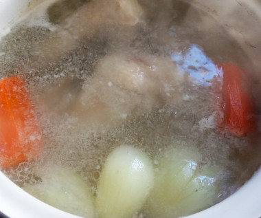 Аккуратно снимите образовавшуюся пенку в кастрюле. Отправьте морковку и лук в бульон, пламя убавьте до умеренного. Варите курицу до готовности под полузакрытой крышкой. У меня на это ушло примерно 30-35 минут.