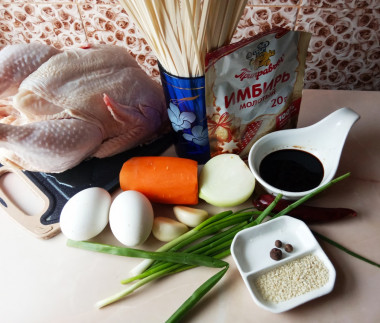 Как сварить суп рамен с курицей в домашних условиях? Подготовьте все ингредиенты для супа. Если у вас курочка из заморозки, то выньте её заранее из морозилки и разморозьте. Я в этот раз использовала два небольших куриных окорочка из расчёта один окорок на одну порцию. Яйца вымойте, отварите вкрутую и очистите.