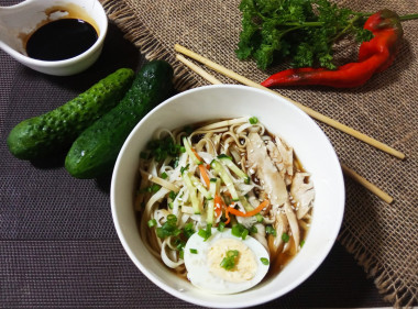 Решила приготовить к обеду суп рамен с курицей. Это несложно, но ярко, интересно, аппетитно! При подаче можно добавить в рамен дольки свежего огурца, помидора, немного корейской моркови или капусты. Очень вкусный суп, рекомендую. Спасибо автору за рецепт!