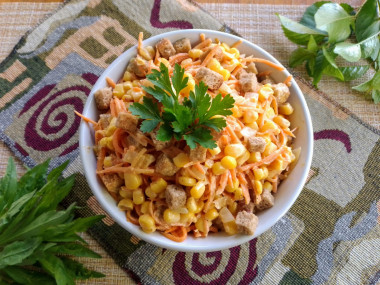 Салат с корейской морковью, сухариками и кукурузой готов. Его можно подавать сразу, если вы любите ощущать в салатах хруст сухарей.
