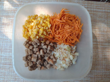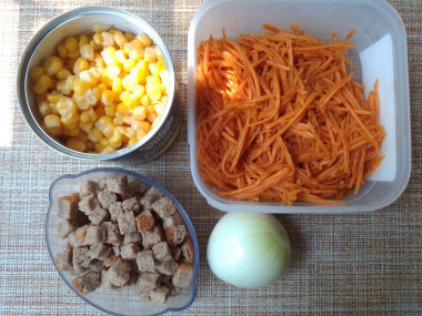 Как сделать салат с корейской морковью, сухариками и кукурузой? Подготовьте все продукты, которые указаны в рецепте. Сухарики можно использовать покупные. Я сделала их сама из нескольких кусочков тостерного хлеба.