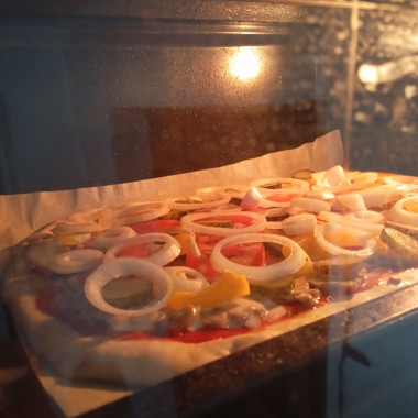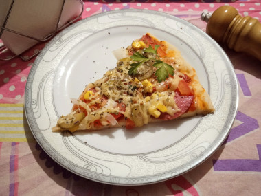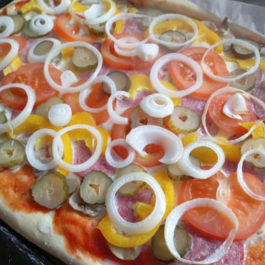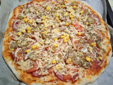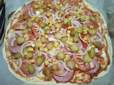 Как же мы любим пиццу! Домашняя пицца самая вкусная и совершенно не конкурент покупной. Нашла на любимом сайте этот рецепт и решила приготовить. Тесто легко и быстро замесила по описанию в рецепте. Для начинки вместо грибов взяла кукурузу, так как ребенок тоже любит пиццу, а грибы ему ещё нельзя кушать. Порезала помидор, колбаску, лук, соленые огурчики для начинки. Раскатала тесто и смазала томатным соусом. Разложила начинку, смазала яичным соусом и посыпала тёртым сыром, как же пицца без сыра (сказал мой ребенок))), от себя ещё посыпала пиццу итальянскими травами, чтоб было ароматнее. Выпекала 12 минут. Ароматная, румяная и невероятно вкусная вышла пицца по этому рецепту. Пицца с солёными огурцами колбасой и помидорами понравилась всем. Особенно интересно было попробовать пиццу с секретным ингредиентом. Супер вкусно! Помидоры придали сочности, огурчики приятно хрустят, колбаска с кукурузой отлично вписались в общую картину. Всё очень гармонично. Пицца яркая, сочная, сытная и невероятно аппетитная! Спасибо автору😊