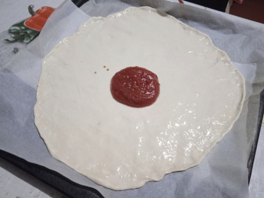 Раскатайте тесто в круг и смажьте поверхность томатным соусом.