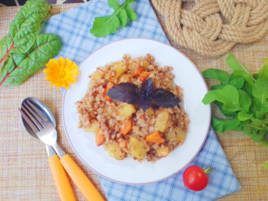 На обед приготовила гречку с картошкой. Такого сочетания я никогда не пробовала и не могла пройти мимо этого рецепта. Делается оно максимально просто. Первым делом я поставила вариться гречку. Пока занималась овощами она уже успела свариться и настояться. И вкус у блюда замечательный, мне очень понравилось! Спасибо!