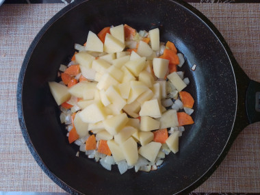 Очищенный картофель нарежьте небольшими кубиками и выложите в сковороду к овощам. Перемешайте. Готовьте все вместе минут 15-20. Картофель должен стать мягкий. Немного подсолите. Можно готовить под крышкой.