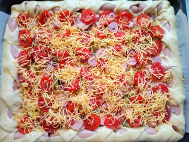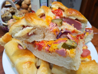 Такую пиццу я еще не пробовала! Это же просто чудо, а не пицца! Кстати сейчас пишу отзыв и понимаю, что я не внимательно посмотрела шаг с сосисками, их надо было разрезать вдоль, а я закатала в тесто целые) У меня была задача сделать большую вкусную пиццу. Этот вариант мне показался подходящим. Обращу внимание, что теста получается много, у меня оно свободно раскаталось на большой стандартный противень. Тесто отличное, оно так здорово поднялось, при раскатке пузырилось, из него можно запросто пироги печь. Мне как раз такое и надо было, мне нужен был вариант толстой сытной пиццы. Муж назвал ее пирогом с сосисками) В начинку я не стала добавлять грибы, дети их не любят. Все остальное добавила, только помидоры у меня обычные. Еще от себя положила полукольца фиолетового лука, он очень хорошо сочетается с начинкой. Пицца реально получалась как пирог, основа пышная, мягкая, воздушная. Начинка получилась сочной, богатой. На вкус просто блаженство! Кстати некоторые дети отрезали краешек и ели "сосиску в тесте"))) Все довольны! Спасибо!