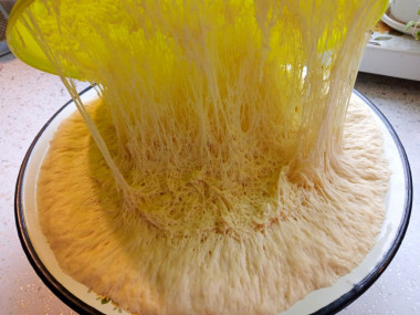 Имейте в виду, что муки у вас может уйти больше или меньше, ориентируйтесь на консистенцию теста. Из теста формируем шар, прикрываем его салфеткой и даем постоять в теплом месте в течение часа, чтобы оно поднялось. Этого количества теста хватит на полноценные три пиццы. Тонко раскатываем тесто диаметром на 2 см больше, чем форма для пиццы.