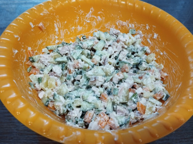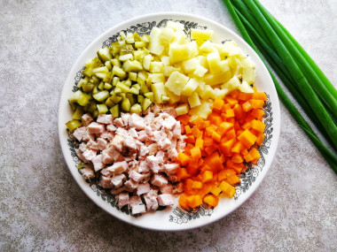 Сварив мясо, картошку и морковь, дала им остыть, затем нарезала всё маленькими кубиками, выложила в глубокую миску, заправила майонезом, посолила.