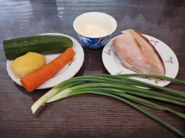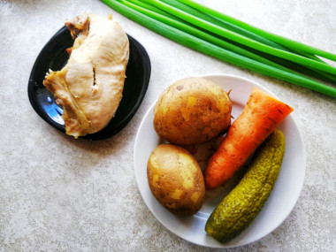 Взяла для салата две картофелены, морковь, зелёный лук, маринованный огурец и куриную грудку, которой я заменила копченую курицу.