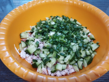 Картофель и морковь отварила до готовности, остудила. Все ингредиенты порезала небольшими кубиками, зелёный лук мелко порезала, выложила в салатник,добавила майонез и перемешала. Соль не добавляла,т.к. для нас соли достаточно в майонезе и копчёной грудке.