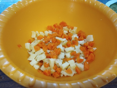 Морковь и картофель предварительно помойте щеткой под проточной водой. Овощи выложите в кастрюлю, залейте водой и сварите при умеренном кипении до готовности. Как проверить готовность овощей? Проткните овощи ножом. Если они мягкие, значит, сварились. Выньте овощи из воды и дайте им остыть. Очистите овощи от кожуры. Картофель нарежьте небольшими кубиками.