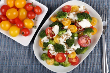 На блюдо выложите вареную капусту брокколи и помидоры черри. При необходимости посолите салат. Но так как брынза у меня достаточно соленая и семечки я брала тоже соленые, дополнительно солить салат не понадобилось.