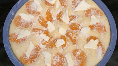 Вылейте тесто в смазанную сливочным маслом форму для выпечки. У меня диаметр формы 20 см. Выложите на тесто дольки мандаринов.