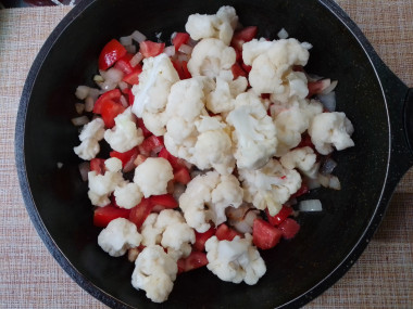 Добавьте к луку цветную капусту. Перемешивая деревянной лопаткой обжаривайте всё ещё несколько секунд.