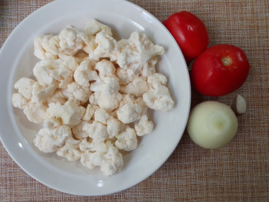 Как сделать цветную капусту с помидорами? Очень просто! Первым делом подготовьте все необходимые продукты для рецепта. Капусту можно взять свежую или замороженную. Помидоры допустимо использовать как свежие, так и консервированные в собственном соку. У меня цветная капуста из заморозки и свежие помидоры. Капусту разберите на небольшие соцветия. Лук и чеснок очистите от кожуры и ополосните.